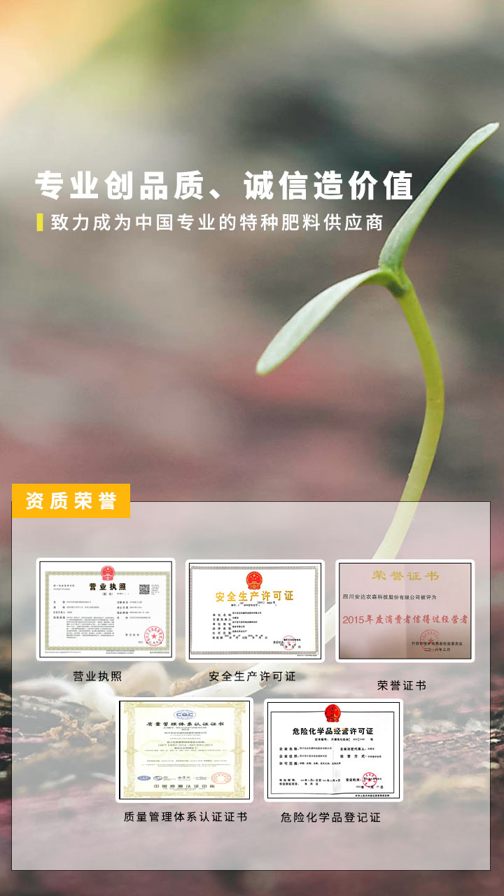 經過二十余年的探索和實踐,依托自身技術和出口背景,按照國際市場規(guī)范培養了大批高素質的專業化技術化團隊,掌握了水溶性肥料的核心技術,擁有完善的研發(fā)中心、質檢中心,目前已獲得多個國家專利技術。公司一直把“做中國專業的特種肥料供應商”作為自身的發(fā)展使命。推廣高端植物營養與先進技術,高效施肥方式的綜合配套方案,減輕中國種植業勞動強度,讓種植業效率更高、效果更強、效益更好!努力成為革新中國種植業生產方式的偉大公司!